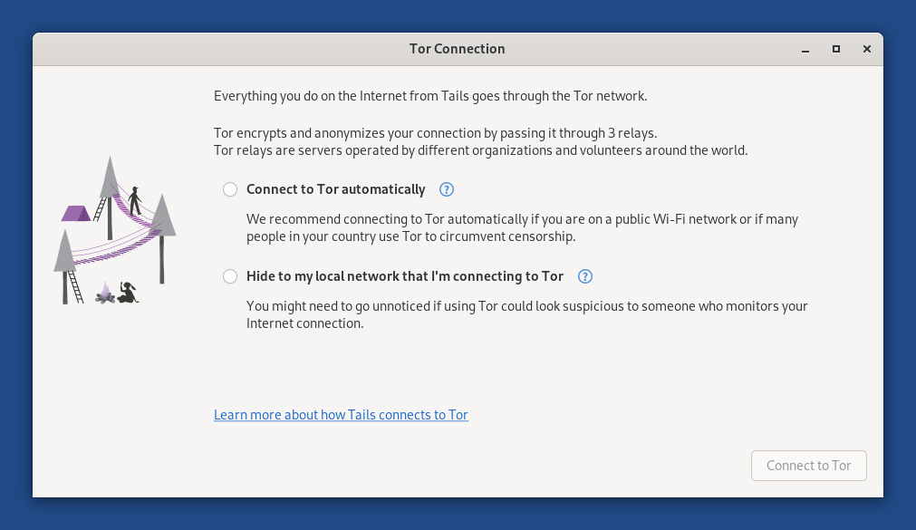 Cuando eliges esta opción, Tails solo se conectará a Tor después de configurar un puente de Tor personalizado. Los puentes son repetidores de Tor secretos que ocultan que te estás conectando a Tor.